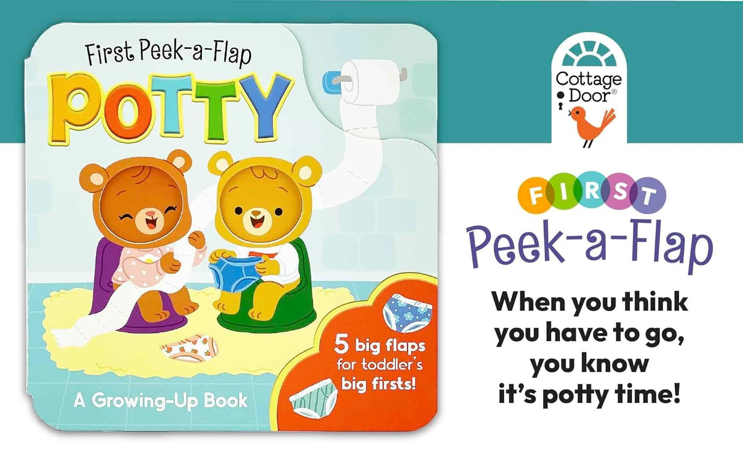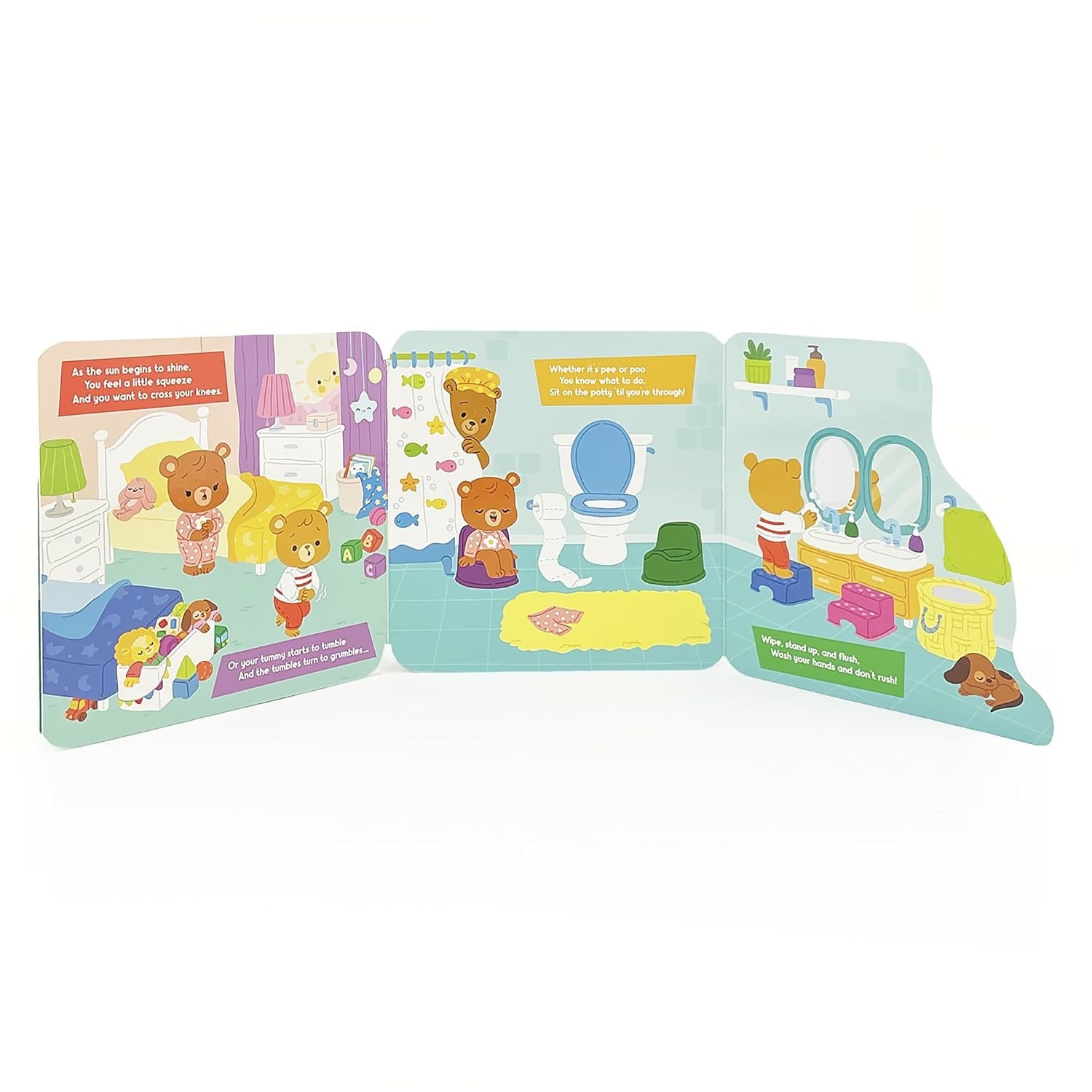 Using the potty in different places like at school, a restaurant, or a friend’s house might feel scary at first, but with practice and good bathroom habits, your child will be ready for potty time anywhere. Peek-a-boo holes and big flaps are just right for little hands. The charming art and rhymes will help make potty training anywhere easy for kids and parents alike.