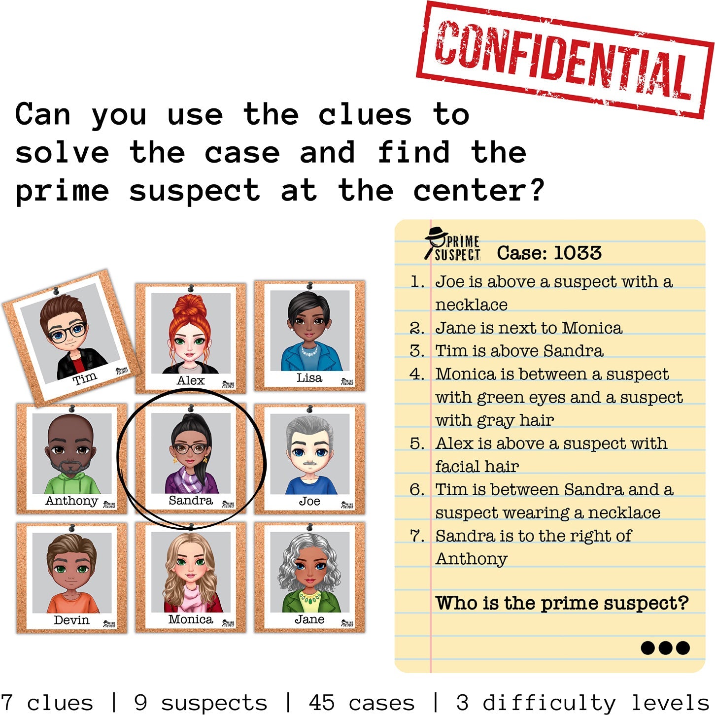 Introducing a captivating new solo play game for fans of whodunits and deductive reasoning! Prime Suspect challenges you to arrange the 9 suspect tiles into a 3x3 grid using the 7 directional clues on each case card. The suspect in the center of the grid when all tiles are placed correctly is the prime suspect for the case! With 3 levels of difficulty and 45 cases to solve, this brainteasing game makes a great stocking stuffer for ages 8+ and even adults! For 1 player.