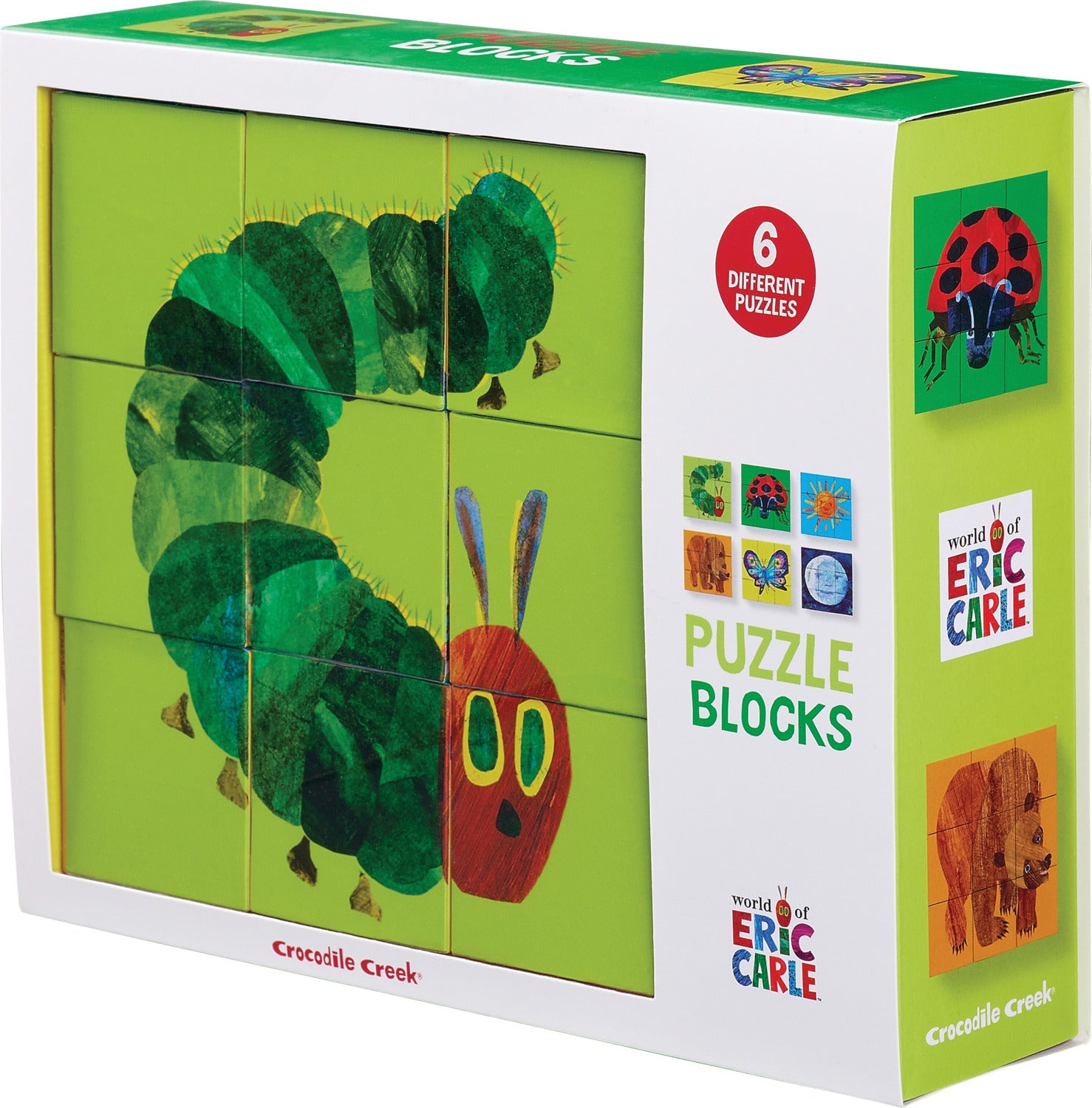 Mix, Match, and Create with The Very Hungry Caterpillar! Bring Eric Carle's beloved storybook world to life with this set of 9 puzzle blocks featuring iconic artwork from The Very Hungry Caterpillar. Each 2.5" heavy-duty cardboard block is beautifully illustrated, allowing kids to mix and match to create the caterpillar, butterfly, and other whimsical creatures—or invent entirely new ones!