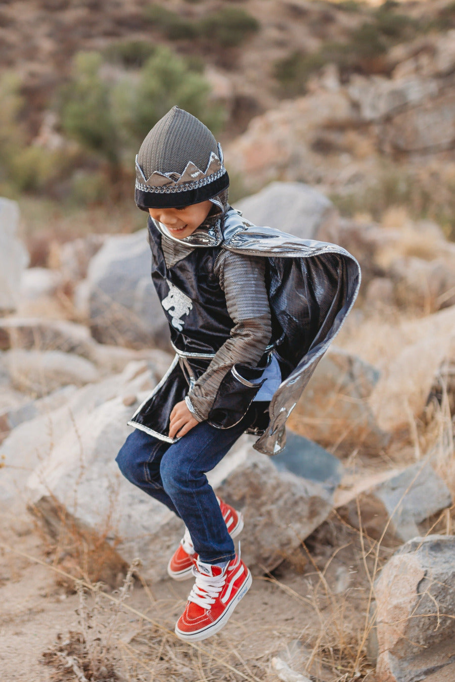 Be off to fight the good fight with this amazing 3 piece gold hooded knight set. This set includes a hooded tunic, knight cape, and gold or silver knight crown. A glitter lion emblem is embellished on the front of a black velour tunic with chainmail-like fabric for the hood and long sleeves. The Velcro on and off cape made out of gold or silver liquid knit adds to complete the outfit. Plus don't forget the last piece, the matching knight crown trimmed with gold or silver detailing!