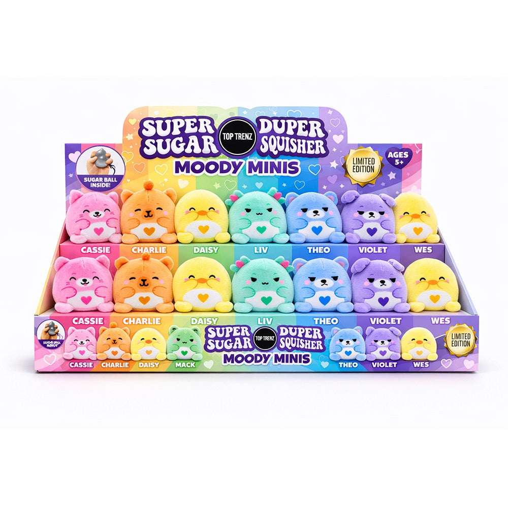 Meet the mini version of our best-selling Super Duper Sugar Squishers Plush — the Plush Moody Minis. These tiny collectibles are packed with personality and filled with our signature Sugar Ball center for that soft, slow, super-satisfying squish everyone can’t stop squeezing.