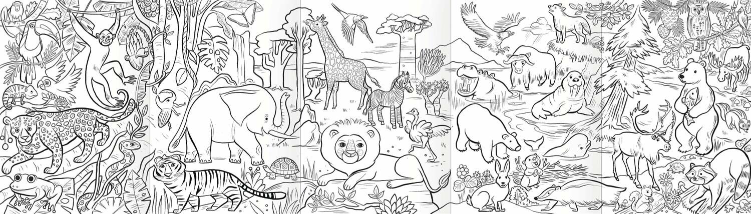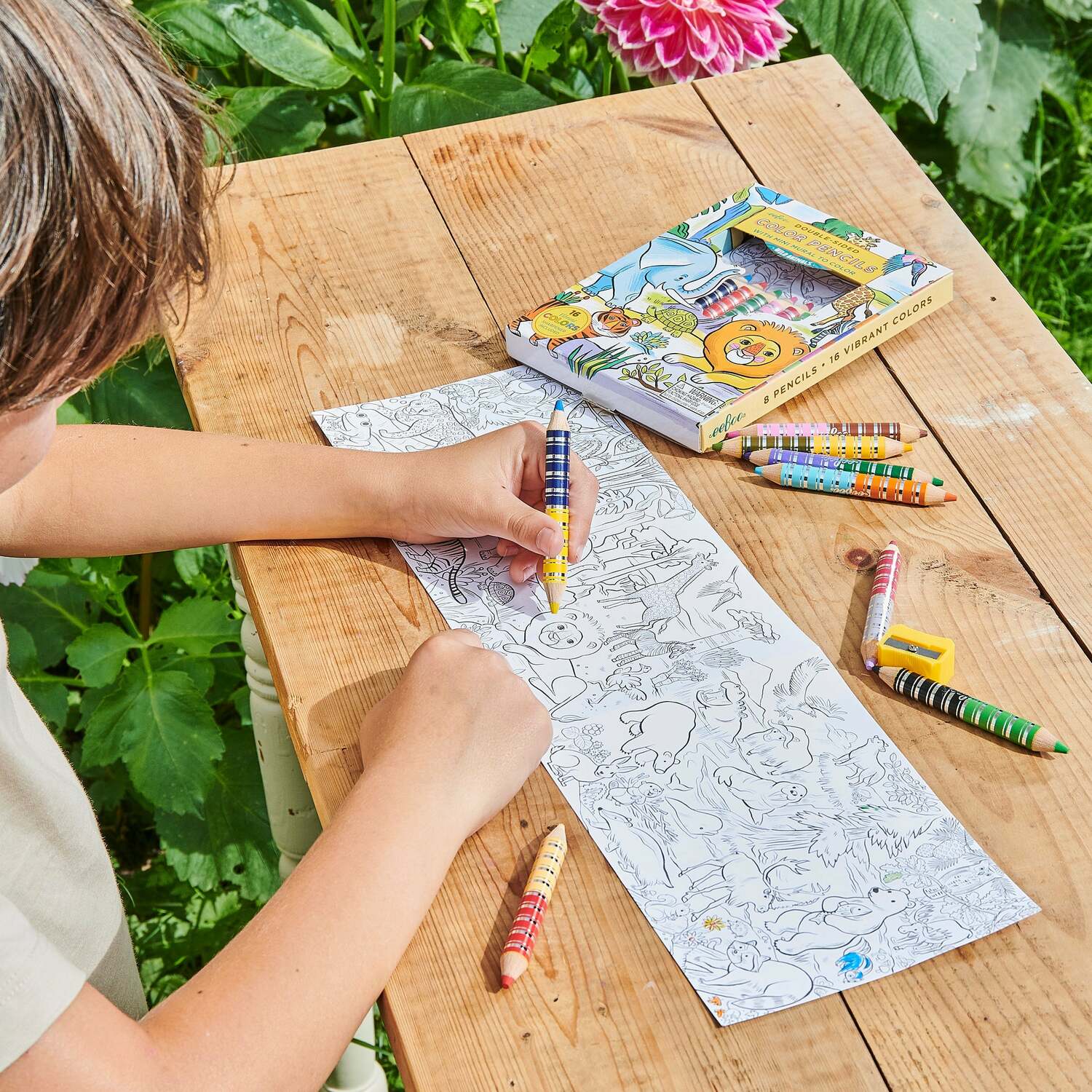 High quality color pencils with 16 colors with a long and detailed fold-out mural to color, filled with wild animals.
